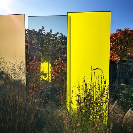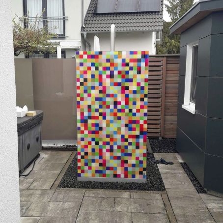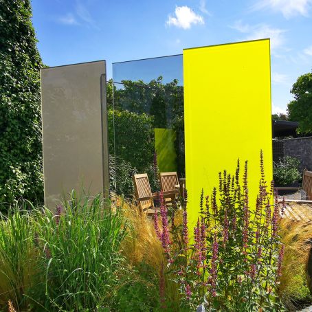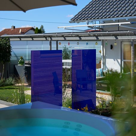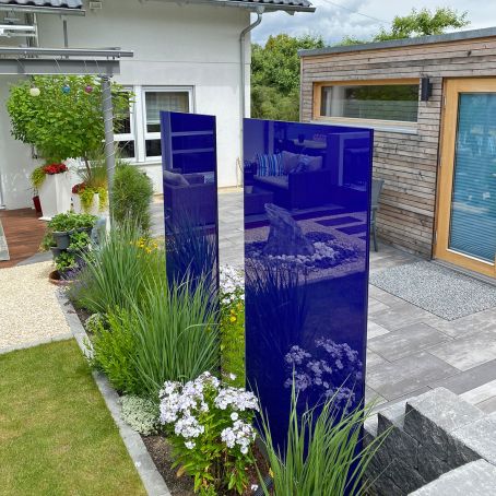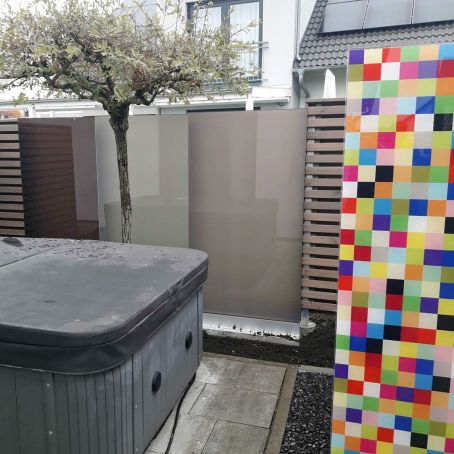 Der Glas-Sichtschutz von KNUMOX ist wetterfest, elegant und funktional – er schützt vor Blicken und Wind und sorgt zugleich für ein faszinierendes Spiel aus Licht und Farbe.