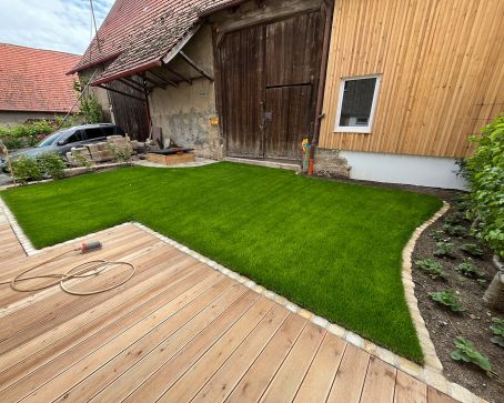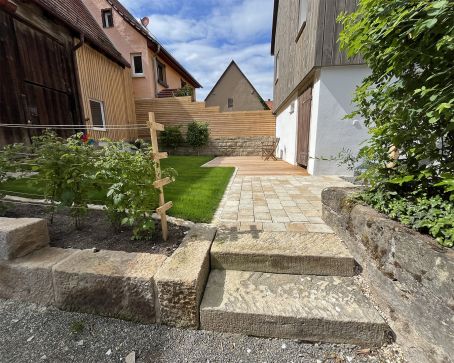 Die Holzwand oberhalb sowie das Holzdeck als Terrasse wurden vom Kunden selbst gefertigt und fügen sich geschmackvoll in das Gesamtkonzept ein. Abgerundet wird das Projekt durch leicht geschwungene Pflasterzeilen aus Naturstein, einem robusten Pflasterbelag und sattgrünem Rollrasen, der dem Garten Frische und Ruhe verleiht.
