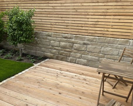 Unser Team hat mit Schilfsandstein eine Stützmauer gebaut, die das Grundstück rahmt und gleichzeitig als dekoratives Element dient. Davor wurde ein schmales Pflanzbeet angelegt, in dem zwei schöne Spalierbäume stehen. Zwischen den Bäumen wachsen zudem leckere Erdbeeren, damit auch die Kinder was zum Naschen haben.