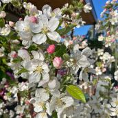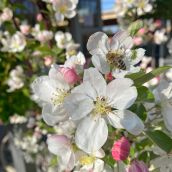Zieräpfel und ihre Blüten zeigen je nach Sorte ein breites Farbspiel von zartem Weiß-Rosa bis hin zu kräftigem Pink oder Purpur. Während helle Sorten eine elegante, leichte Wirkung entfalten, setzen dunkler blühende Zieräpfel gezielte Farbakzente im Garten. Die Blüten sind eine wertvolle Nahrungsquelle für Bienen und andere Insekten. Im Herbst schmücken zahlreiche kleine, oft leuchtend gefärbte Früchte den Baum und bleiben teils bis in den Winter hinein ein dekorativer Blickfang.